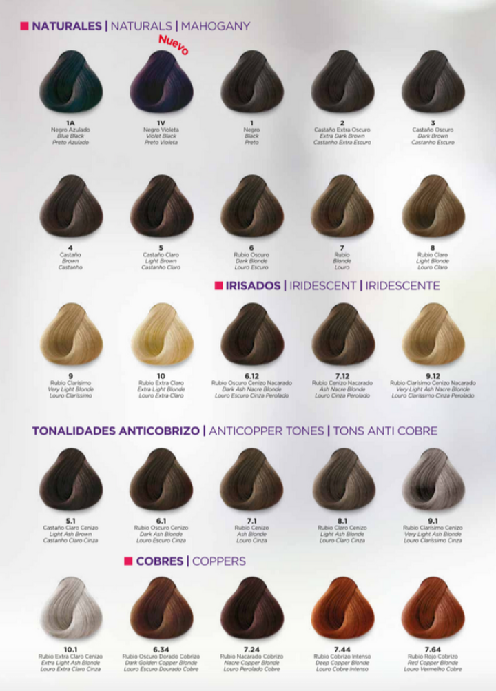 Sistema de coloración que incorpora en su fórmula componentes nutritivos como la proteína de trigo y aceite mineral que brindan ingredientes esenciales para la regeneración del cabello, dando como resultado sedosidad, hidratación, brillo y color intenso